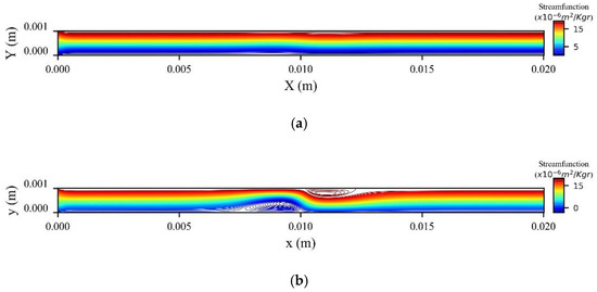Stream function contours when (a) the MNPs are inserted in the microchannel from the inlet (b) the MNPs are injected from the upper wall of the microchannel at .