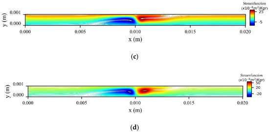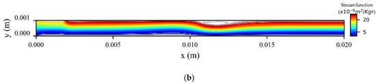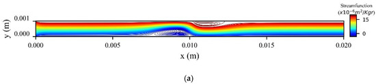 Figure 14a shows the stream function contours computed at the peak systolic velocity () when MNPs enter the microchannel from the inlet, while Figure 14b when the MNPs are injected from the upper wall. In the former, two recirculation zones (vortices) are formed upstream and downstream to the magnetic source, while in the latter only one recirculation zone (vortex) is formed upstream the magnetic source at the upper wall.