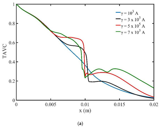 Figure 7a shows the variation of TAVC along the upper wall of microchannel versus volume fraction . We observe that as the volume fraction increases, there is an increase in the deposition of MNPs on the upper wall. Figure 7a shows a steep decrease of TAVC close to the magnetic source.