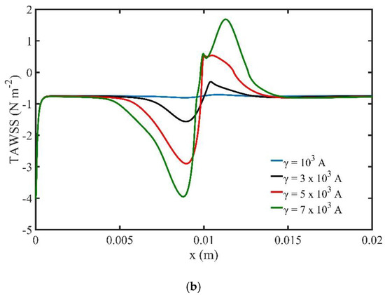 Figure 11a shows the variation of TAVC along the upper wall versus the intensity of the magnetic field γ for one period of the cardiac cycle. We observe that, when the strength of the magnetic field increases, the deposition of MNPs on the upper wall increase upstream the location of the magnetic field source. Moreover, the diagram shows a steep decrease of TAVC close to the magnetic source. The maximum TAVC value appears close to the magnetic source and is observed for the magnetic field strength . Figure 11b presents the TAWSS along the upper wall of the channel versus magnetic field strength. The strength of the magnetic field affects the TAWSS on the upper wall of the channel. Close to the magnetic source we observe high negative and positive levels of shear stresses. Higher levels of TAWSS can be noticed when the strength of the magnetic field increases.