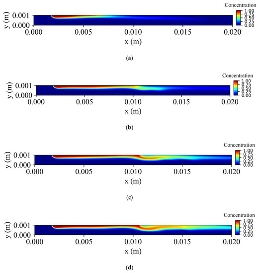Dimensionless volume concentration of MNPs at different times during a cardiac cycle (a) , (b) , (c) , and (d) when they are injected from the upper wall.