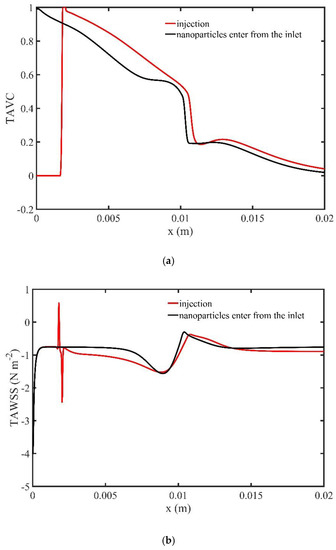 (a) Time average volume concentration (TAVC) and (b) Time average wall shear stress (TAWSS), along the upper wall for one period of cardiac cycle and two ways of MNPs approach to the targeted tissue.