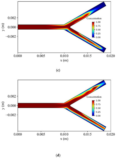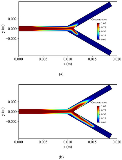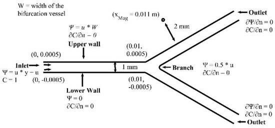 The branching angle and the diameter ratio in epicardial coronary artery bifurcations are two important factors of atherogenesis [46]. In this section, we examine the effect of different branching angle () of the bifurcation vessel on the MNPs concentration and the flow field. We present numerical results for the MDT biomagnetic (blood and dispersed MNPs) fluid flow in a microchannel (vessel) with bifurcation. Details on the geometry and the boundary conditions are in Figure 19. We set the MNPs volume fraction to , and the intensity of the external magnetic field to . The magnetic field is located at . We simulate two cardiac cycles. We use a grid of 120,000 nodes, which ensures a grid independent numerical solution. The time step was set to s.