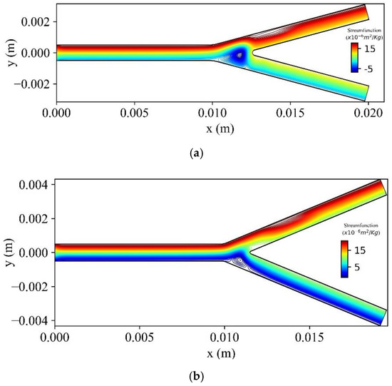 Figure 20 shows the stream function contours for three bifurcation angles (, , ) at t = 1.6 s. As the bifurcation angle decreases, a vortex is generated at the lower wall of the bifurcation.