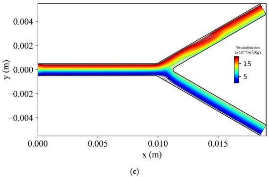 Stream functions contours for three bifurcation angles (a) , (b) and (c) at time .