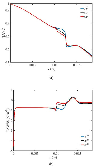 Figure 22a shows the variation of the TAVC along the upper wall of the bifurcation for various bifurcation angles. We observe that as the bifurcation angle decreases, there is an increase of TAVC of the magnetic field source. Finally, Figure 22b shows the variation of the TAWSS along the upper wall of the three bifurcations. The bifurcation angle affects the TAWSS upstream of the magnetic source, while downstream of the magnetic source the TAWSS maintains their values to the same order of magnitude.