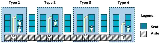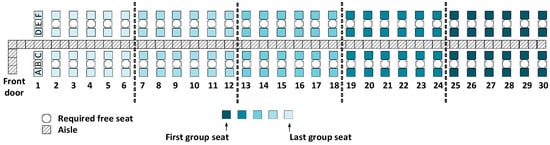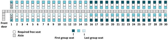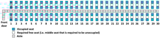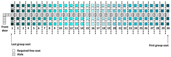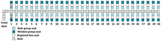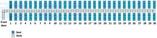 In this paper, we use a single-door Airbus A320 configuration with one aisle, thirty rows, and three seats on each side of the aisle, as suggested by [,] and depicted in Figure 1. All seats are considered economy class.