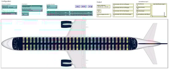 To present the inside of the airplane cabin, the “patches” agents were used, each of them possessing different characteristics in accordance with their purpose, either to represent the aisle, seats, or the spaces between the seat rows. The “patches” are small square pieces of ground, each of them measuring 0.4 m × 0.4 m, as suggested by [,]. A series of properties were assigned to each patch, as stated in [].