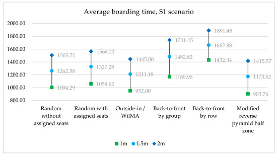 Considering an aisle distancing of 1 m, the average times to complete boarding are shown in Table 3. The method providing the fastest boarding time was the modified reverse pyramid half zone, with an average boarding time ranging between 8 min 38 s and 15 min 3 s, depending on the types and quantities of passengers’ carry-on luggage. The second-fastest boarding method was WilMA, ranging between 9 min 8 s and 15 min 52 s. Random without assigned seats and random with assigned seats yielded comparable results, while the method with the largest boarding time was back-to-front by row, which offered a boarding time between 12 min 59 s and 23 min 52 s. For the S1 luggage situation, the back-to-front by row method resulted in a boarding time that was 58.58% longer than that resulting from the modified reverse pyramid half zone method.