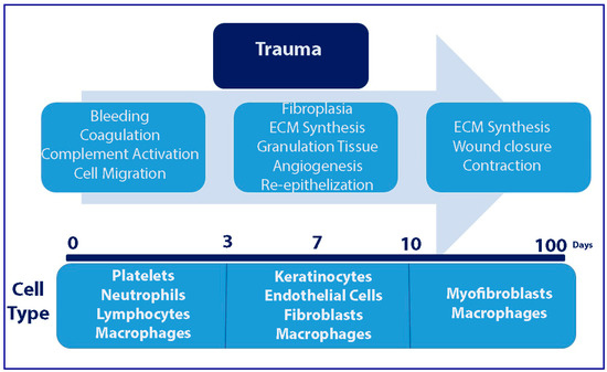Some of the most complicated and interactive processes in human life are repairing epidermal, superficial partial-thickness, deep partial-thickness, and full-thickness wounds [12,13,14]. Indeed this process can support intricate interactions between extracellular matrix molecules and other subtypes. Researchers have claimed that soluble mediators, different resident cells, extracellular matrix molecules, and infiltrating leukocyte subtypes can reestablish damaged parts and replace the lost area. For this purpose, five stages that include hemostasis, inflammation, migration, proliferation, and maturation [12] have been introduced for the wound healing process. Figure 1 represents various stages of the wound healing process.