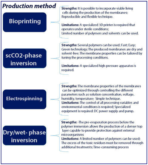 The electrospinning method is capable to produce fibrous membranes that are equivalent to the native extracellular structure. After loading the main polymeric solution into the syringe and exposing it to the high voltage electric field, the solution is directed to the collector and finally, the nanofibers are produced. Many researchers have claimed that different factors like environmental conditions [47,48,49], processing variables (like the voltage, flow rate, and collector size) and characteristics of polymeric solution (e.g., solvent type, conductivity, and viscosity) can immediately influence the aforementioned process. Additionally, it is necessary to mention that by manipulating the material used and optimizing the nanofiber deposition items like orientation, density, and size, the properties of asymmetric membranes can be simply controlled [50,51,52] (Figure 2c). The last methodology that can be applied in the production of membranes is called the wet-phase inversion technique. This method includes the casting polymer immersion (under non-solvent coagulant bath) that can improve the deposition process and therefore main membranes are formed. One of the major factors that is influenced by the phase separation process’s duration is the formation of a porous sub-layer with a dense top layer [53]. However, the obtained membrane often demonstrates a thin top layer and some defects. Additionally, the dry/wet-phase inversion can begin the formation of the membrane under a pre-evaporation process before the polymer absorption into the coagulation bath. Indeed, this process can not only enhance the polymeric solution’s density but also a denser top layer is created that can protect the critical area of the wound from various contaminations [54,55,56] (Figure 2a). Figure 3 has summarized the advantages and disadvantages of all of the techniques.