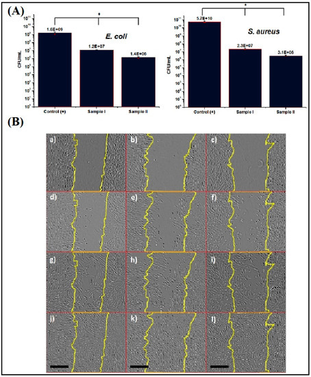 (A) Antibacterial effect of asymmetric membranes against Escherichia coli and Staphylococcus aureus. (B) Evaluation of cell viability under the effect of carvacrol release by the wound healing assay in human dermal fibroblasts incubated without membrane (control; a,d,g,j), with Sample I (b,e,h,k) or with Sample II (c,f,i,l) at the different time points studied: 0 h (a–c), 24 h (d–f), 48 h (g–i), and 72 h (j–l). Scale bar, 500 μm [92].