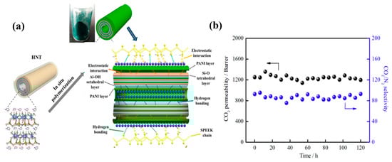 - Wang, Y.; Zhang, X.; Li, J.; Liu, C.; Gao, Y.; Li, N.; Xie, Z. Enhancing the CO2 separation performance of SPEEK membranes by incorporation of polyaniline-decorated halloysite nanotubes. J. Memb. Sci. 2019, 573, 602–611. [Google Scholar] [CrossRef]