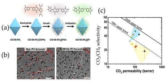 - Wang, H.; He, S.; Qin, X.; Li, C.; Li, T. Interfacial Engineering in Metal-Organic Framework-Based Mixed Matrix Membranes Using Covalently Grafted Polyimide Brushes. J. Am. Chem. Soc. 2018, 140, 17203–17210. [Google Scholar] [CrossRef]