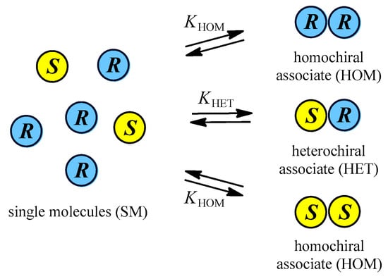 The dynamic equilibria of a chiral compound that forms homo- (HOM) and heterochiral (HET) associates will yield different distributions of the enantiomers between the various associates depending on their concentrations and the values of Khom and Khet. The transitory associates formed in solution may consist of dimeric or higher-order oligomeric associates of variable size, but are depicted here only as dimers for clarity. Due to dissimilar δ’s for SM, HOM, and HET, enantiopure and racemic solutions can thus present distinct spectra, and even distinct signals for the two enantiomers can result in the case of scalemates [1,3].