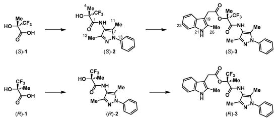 In one of our drug discovery projects, we recently encountered the SIDA phenomenon, which caused us to ponder the identity of a pair of synthesized enantiomers and their resulting derivatives. This process and the enigmatic results presented by the compounds were examined in detail and the results are reported herein. In particular, we were interested in determining the solution-state association preference, i.e., whether HOM or HET are favored. There are a number of means to do this by NMR, including evaluation of T1s, T2s, and δ’s—though careful interpretation is generally required for these parameters—as well as by more direct methods, including diffusion measurements, enantiomeric titration [2,4], serial dilution, and nuclear Overhauser effect (NOE) measurements. Knowledge of the solution-state association preference can have valuable practical application: For example, which portion—the racemic portion or the enantiomeric excess portion—is likely to elute first under chromatographic conditions that will lead to the self-disproportionation of enantiomers (SDE), a related phenomenon [5,6,7,8,9] also based on the association of chiral molecules. Such knowledge is particularly applicable for size-exclusion chromatography [10]. An explanation of the SDE phenomenon is also provided in Appendix A.
