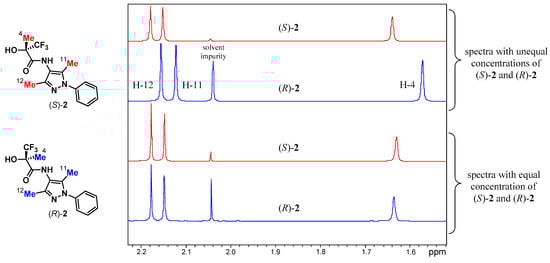 1H NMR spectra of (S)-2 (red spectra) and (R)-2 (blue spectra) in CDCl3. The original spectra (top two traces) showed considerable differences for the methyl signals H-4, H-11, and H-12 due to unequal concentrations (2-fold), while samples prepared at the same concentration (bottom two traces) are considered identical. Regions for the OH, NH, and aromatic signals are presented in the Supplementary Materials (Figures S1 and S2).