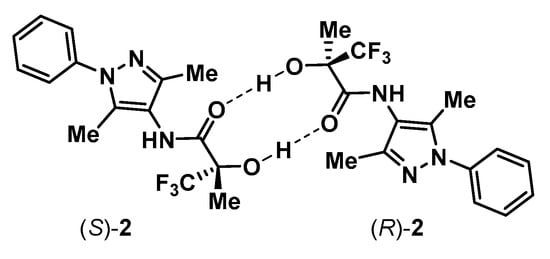 Possible structure of a hydrogen bond-based heterochiral dimeric associate of (S)-2 and (R)-2. Such a structure has Ci symmetry and is therefore achiral while a homochiral dimeric associate would have C2 symmetry and be chiral. The sizeable deshielding of the amide proton signal is also indicative of it participating in hydrogen bonding concomitant with molecular association and analogous dimeric associates involving it instead of the hydroxyl proton can be envisaged.