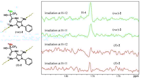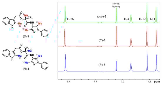 1H NMR spectra of (R)-3 (bottom trace), (S)-3 (middle trace), and (rac)-3 (top trace) in CDCl3 at the same concentration for the region encompassing the methyl signals H-4, H-11, H-12, and H-26 revealed little difference between the spectra. Spectra showing the NH, methylene, and aromatic signals are presented in the Supplementary Materials (Figures S6–S13).