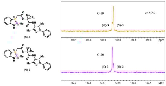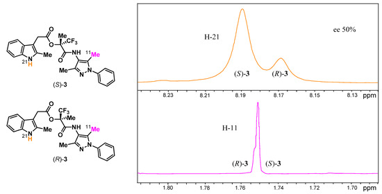 We did not expect analogous intermolecular interactions, and therefore SIDA, for esters 3 as the hydroxyl group, which we thought to be important for forming the intermolecular hydrogen bonds in alcohols 2, is not available. Indeed, samples of (S)-3, (R)-3, and (rac)-3 at identical concentrations in CDCl3 all provided closely matched 1H (Figure 6, Figures S6 and S7), 19F (Figure S8), and 13C (Figures S9–S13) NMR spectra. While this pointed to the anticipated lack of association, we realized another scenario, although unlikely, was still possible: If 3 has similar values of Khom and Khet, together with very similar δ’s for HOM and HET, the spectra would appear nearly identical despite association being operative. Upon careful examination, association did appear to be taking place in CDCl3 as evidenced by concentration-dependent Δδ’s, albeit to a lesser extent than was observed with alcohols (S)-2 and (R)-2, and peak splitting of (scl)-3. For example, a 3.4-fold increase in the concentration for ester (S)-3 only led to slight shielding of the imidazolyl and alkyl methyl H’s (0.01, 0.01, and <0.00 ppm) (Figure S16) in comparison to the analogous Δδ’s for a 2-fold increase in the concentration for alcohols (S)-2 and (R)-2 (0.02, 0.03, and 0.07 ppm) (Figure 3). By contrast, the signals of the indolyl methyl Hs of ester (S)-3 were shielded by 0.05 ppm with a 3.4-fold increase in concentration (Figure S16). With increased concentration, the signals of the aromatic indolyl protons H-22 and H-23 were shielded significantly (by 0.06 and 0.03 ppm, respectively), while the signals of the phenyl H’s, like for alcohols (S)-2 and (R)-2, and the signals of the methylene H’s were only slightly shielded (Figures S17 and S18). As observed with alcohols 2, both the amide and indolyl NH signals of ester (S)-3 were deshielded with increasing concentration (Figure S17), thus in contrast to all other carbon-bound signals, which were shielded. The deshieldings of the amide and indolyl NH signals were smaller for 3 compared to 2, thereby indicating weaker hydrogen bonding in the molecular associates. Of note though, the indolyl NH signal shifted much more than the amide NH signal: 0.29 vs. 0.04 ppm. Furthermore, peak splitting (Figure 7 and Figure 8) in the spectrum for a sample of (scl)-3 in CDCl3 (50% ee) was only of very small magnitude and was only evident on two proton signals (H-11 and H-21), not evident at all on the fluorine signal, and only observed on five carbon signals (C-7, C-13, C-19, C-20, and C-23), none of which were methyls.