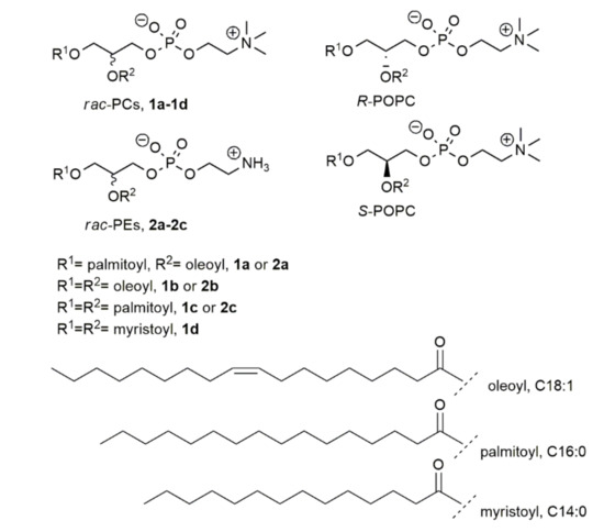 First, to further delineate the properties of chiral and racemic phospholipids, a more stringent physico-chemical analysis of vesicles (enantiopure, racemic, scalemic) will be performed: (a) Turbidity variation induced by shrinking and swelling vesicles as measured by UV spectrometry [57]. (b) Dynamic light scattering and/or spectrophotometry, to monitor morphologies as a function of temperature and the addition of cryoprotectants such as trehalose or other chiral mono/disaccharides. Racemic/enantiopure fatty acid vesicles made of chiral α-methyl fatty acids behave differently under temperature stress, the homochiral ones being more stable [58]. (c) Effects of detergents such as β-d-octylglucopyranoside or sodium cholate (both chiral) affecting the membrane permeability to peptides. (d) Vesicles doped with small amounts of anionic surfactants and subjected to the presence of cationic proteins to determine recognition property of vesicles. (e) Osmotic stress, under the above mentioned conditions. For example, the interaction between anionic vesicles and lysozyme revealed specific properties of vesicles [59,60,61]. Likewise, the opposite can be done, i.e., membranes doped with cationic lipids and interactions with polyanions (poly (Glu), nucleic acids, etc.).