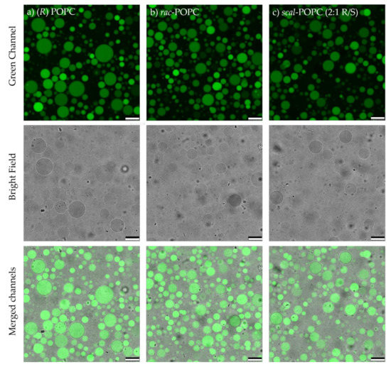 The visual inspection of microscopy images (Figure 2) revealed no major morphological differences between the three samples suggesting that under the experimental conditions tested (low ionic strength, high sugar concentration, 25 °C) the POPC chirality was not critical to the primary goal of forming GVs. Moreover, the green fluorescence detected inside GVs confirmed that in all cases the entrapment of solutes was clearly achievable. These two essential conclusions are key pre-requisites for the future employment of racemic GVs in this field.