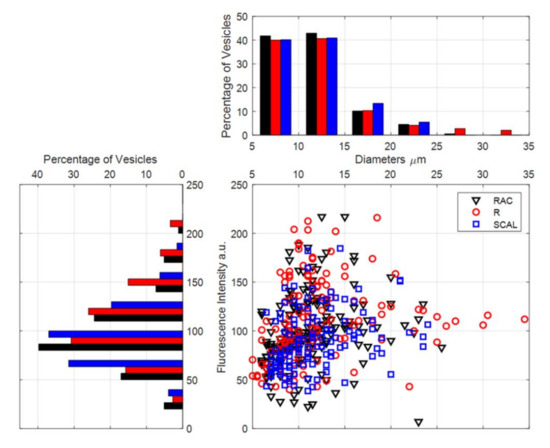 The diameter (µm) and the internal fluorescence (a.u.) of each GV in three samples (rac-POPC, (R)-POPC, scal-POPC) were measured by quantitative image analysis and reported as dot plots in Figure 3. The three different populations largely clustered in the same region of the diameter-fluorescence dot-plot, qualitatively showing their similar structure and size–content relationship. A quantitative Kolmogorov–Smirnov analysis of the size distributions (Figure 3, top histogram) and fluorescence distributions (Figure 3, left histogram) revealed that the size distributions of the three samples were not statistically different at the 95% confidence level. The only statistically significant difference was detected between the calcein fluorescence distributions of (R)-POPC and scal-POPC GVs as indicated by Kruskal–Wallis ANOVA (p < 0.01) because their distributions were not normal.