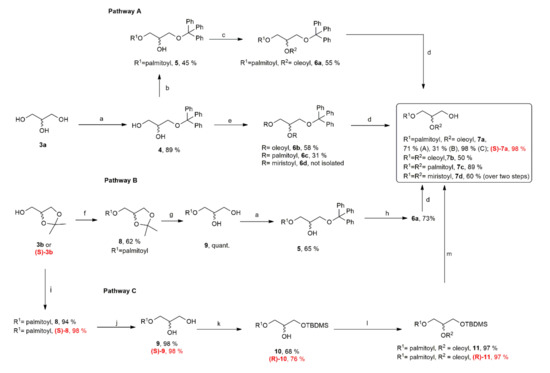 Pathways A–C used for the synthesis of key compound 7a and schematic preparation of rac-DAG 7b–7d. (a) 3a, TrtCl (0.25 equiv.), DMAP (0.005 equiv.), Et3N (0.03 equiv.) dry THF, 16 h, r.t.; (b) 4, Palmitic anhydride (1.1 equiv.), DMAP (1.1 equiv.), CHCl3, 48 h, 0 °C to r.t.; (c) 5, oleic acid (1.3 equiv.), DMAP (1.3 equiv.), EDC∙HCl (2.6 equiv.), pyridine (2.6 equiv.), dry CH2Cl2, 16 h, r.t.; (d) HCl 37% (50 mmol, 44 µL) in 30 mL CHCl3: MeOH 1:1 (v/v), added for 6 h at 0 °C to a solution 8a–8d dissolved in 30 mL CHCl3: MeOH 1:1 (v/v), then 16 h at 0 °C; (e) 4, acyl chlorides (1.3 equiv), DMAP (1.3 equiv), 16 h, r.t; (f) 3b, Palmitoyl chloride (1.25 equiv.), DMAP (1.25 equiv, dry CH2Cl2, 16 h, r.t.; (g) 9, Amberlyst–15, (1:10 w/w), dry CH2Cl2, 4 h, r.t.; (h) 5, oleoyl chloride (1.25 equiv.), DMAP (1.25 equiv.), dry CHCl3, 16 h r.t.; (i) 3b, Palmitic acid (1.1 equiv.), EDC∙HCl (1.3 equiv.), DMAP (0.3 equiv.), dry CH2Cl2, 16 h, r.t.; (j) 8, AcOH:H2O (4:1 v/v), 2 h, 55 °C; (k) 9, TBDMSCl (1.1 equiv.), imidazole (1.5 equiv.), dry CH2Cl2, 16 h, r.t.; (l) 10 or (R)-10, oleic acid (1.1 equiv.), EDC∙HCl (1.3 equiv.), DMAP (0.3 equiv.), dry CH2Cl2, 16 h r.t; (m) 11 or (R)-11, Et3N∙3HF (5 equiv.) in THF:MeCN (1:1 v/v), 7 h, r.t.