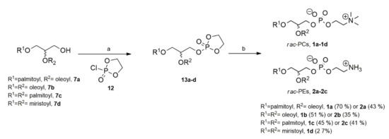 Compounds 7a–7d were used to prepare the corresponding PCs (1a–1d) and PEs (2a–2c) via cyclic phosphotriester intermediates 13a–13d by nucleophilic addition of dry trimethylamine or ammonia (Scheme 2). The synthetic procedures are well known [9] and the racemic diacyl glycerols 7a–7d obtained following pathways A–C were used. Purifications of the crude materials were carried out using flash chromatography as reported in Appendix A.