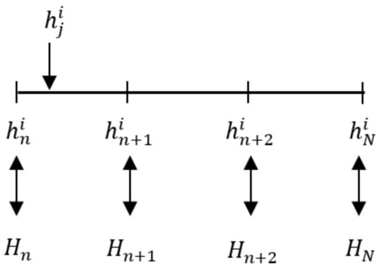 Let each qualitative criterion be assessed using its own set of grades, . The original assessment of alternative for criterion , or , can be defined by Equation (3).