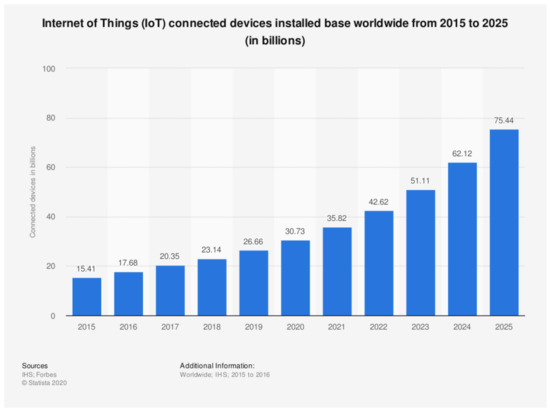 - Statista Research Department. Internet of Things (IoT) Connected Devices Installed Base Worldwide from 2015 to 2025 (In Billions); Statista Research Department, Ss. Cyril and Methodius University in Skopje, Faculty of Computer Science and Engineering: Skopje, North Macedonia, 2020. [Google Scholar]