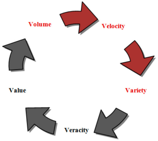 Big data characterizes the set of large volumes of data for which it is difficult or even impossible to collect and process using traditional data processing tools. The literature defines big data according to a formalism called V; three to five Vs allow the characterization of this mass of data [18]. For Doug Laney [1], big data is characterized by the volume, speed, and variety of data, giving rise to the 3 Vs principle. Volume describes the size of the data, velocity refers to the speed at which the data is produced while variety describes the range of data types and sources. Recently, an additional “V” has been added to this definition. For example, in [1,19], the authors have added two “Vs” to the first three. Thus, the fourth “Vs” refers to the value or variability while the fifth “Vs” refers to the veracity of data. Other more recent works have further integrated other Vs (6 Vs, 7 Vs, and 9 Vs) [20] to further define the contours of these big data. Figure 3 shows the main large dimensions of the data.