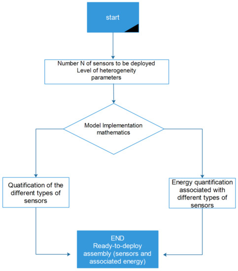 The different kinds of sensors and the associated energy resources can be quantified using a mathematical model. Less models in the literature take into account the general heterogeneity at several levels. The number of sensors in a network and their energy resources are completely independent, which is not, for instance, the case in the works of Quig et al. [37], since the authors randomly assign each sensor an energy source for a given interval. Inspired by the model described in [38] for WSNs, we designed a generic model for LS-WSNs. A flowchart of the proposed model is given in Figure 4.