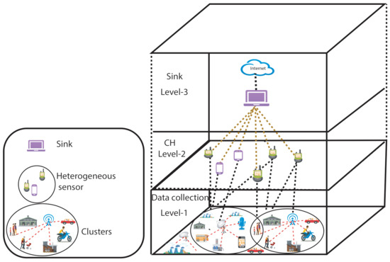 The LS-WSN model we propose is built according to a three-level architecture (see Figure 5): the first level consists of a set of sensors (member nodes) whose role is to gather and send information to their corresponding CHs. The sensors do not have the same communication range.