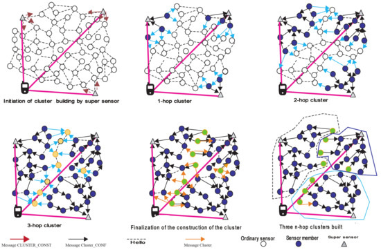 Our clustering algorithm builds cluster trees with k-hops (the distance between a node and its cluster leader is at most k-hops). The Cluster formation begins with a neighborhood discovery phase followed by the cluster construction phase initiated by the various cluster construction sensors. The different phases of our algorithm are summarized in the Figure 6 and described in the Algorithm 1. The proposed clustering is dynamic, so sensors can integrate or exit a cluster at any time. The procedure for a sensor to join a new cluster is described as follows: