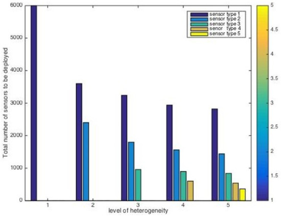 Our LS-WSN model consists of heterogeneous sensors. For N sensors to be deployed and at a level of heterogeneity, i.e., the number of different kinds of sensors, we propose to determine the number of different types of sensors involved in the formation of the network.