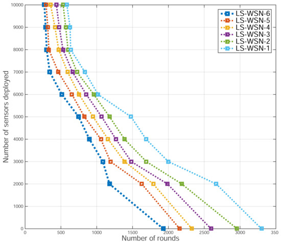Furthermore, functional sensors are sensors that have not yet exhausted their energies. In the homogeneous LS-WSNs scenarios, sensors exhaust their energy around the 668th data sending round, whereas for the heterogeneous LS-WSNs in all its variant, all sensors keep their energy as long as possible, as shown in Figure 8. In the case of LS-WSN-2, the first sensors exhaust their energy at the 269th round and the last ones exhaust at the 2158th round. In the case of LS-WSN-6, the first sensors exhaust their energy at the 583rd round and the last nodes die at the 3299th round. As it can be seen from Figure 8, among all levels of heterogeneity, the LS-WSN-6 offers the longest network lifetime. This allows us to conclude, in the context of the LS-WSNs, that sensor heterogeneity maximizes network lifetime.