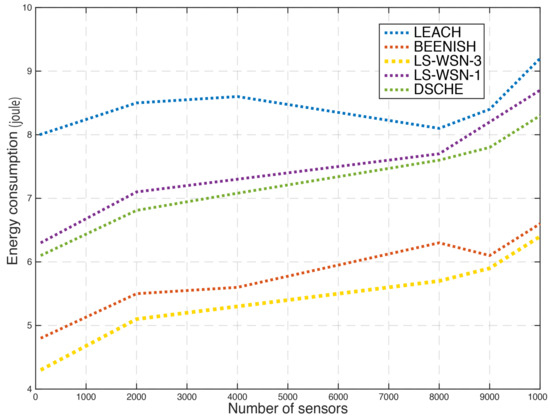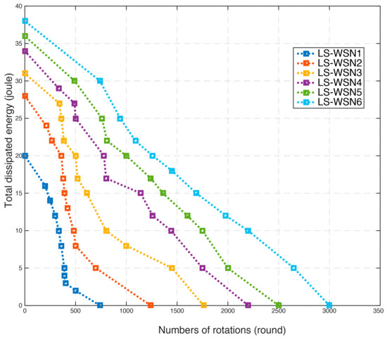 To confirm the hypothesis of sensor heterogeneity in the LS-WSN life extension, we evaluated for each network the sum of energy dissipated in a given period and according to its level of heterogeneity, as shown in Figure 10. This measurement refers to the instantaneous amount of energy exhausted by a network during a data transfer cycle, i.e., the difference in energy from the beginning of the cycle to its end. Here, the total initial energies were J, J, J, J, J and J, for -1, -2, -3, -4, -5, and -6 sensors respectively. As it can be seen from the results presented in Figure 10, the LS-WSN-6 outperformed the LS-WSN-1, LS-WSN-2, LS-WSN-3, LS-WSN-4 and LS-WSN-5. Thus, the energy dissipation (in Joules) rate was a decreasing function of the increasing level of heterogeneity of the LS-WSN.