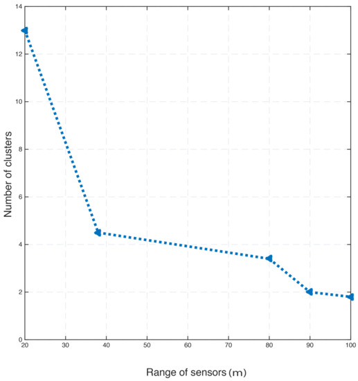 On the other hand, Figure 12 shows that the number of CHs built in the different heterogeneous networks depends on the range of sensors. We noticed that the number of CHs decreases regularly as a function of the range of the nodes. This is explained by the fact that the increase of the range leads to the increase of the number of neighbors (degree) for each node. Under these conditions, the number of members in a cluster increases and consequently the number of CHs created decreases.
