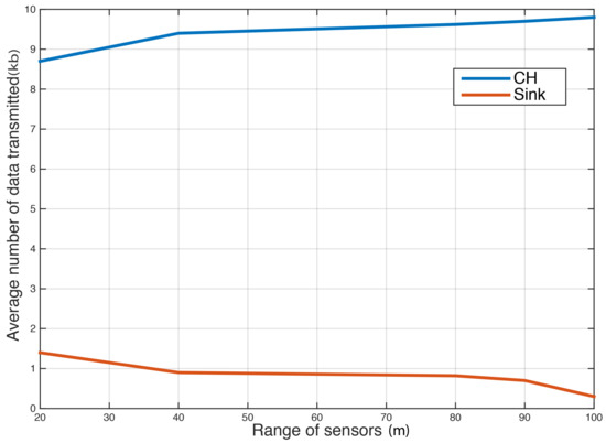 From results presented in Figure 13, it can be observed that the evolution of the average number of packets sent to the BS (resp. to the CHs) was a function of the range of the nodes. The number of packets sent to the CH increased steadily with the range of the sensors, this is due to the amplification of the cluster members by multiplying their coverage areas. Moreover, Figure 13 shows that the second curve was the opposite of the first. Indeed, increasing the range of the nodes minimized the number of created CHs and subsequently reduced the number of packets sent to the BS.