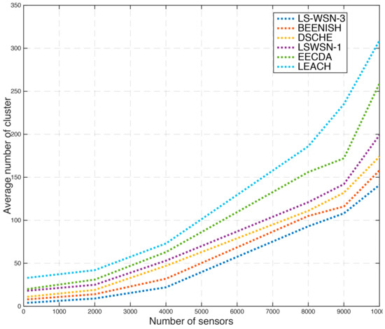 Furthermore, Figure 14 represents the average number of clusters constructed as a function of the cardinality of the network for the different algorithms. We noticed as well that the number of clusters increased regularly with the size of the network. Moreover, from Figure 14, we noticed that our algorithm produced fewer clusters in most cases (size between 40 and 200) compared to protocols such as LEACH and DSCHE whose number of clusters increased while scaling of the number sensors. Finally, the specificity of our algorithm lay in the fact that the same number of CHs could be used to manage a network of increasing size. This is explained by the efficiency of the structure created by our algorithm in its ability to adapt when adding sensors to the network.