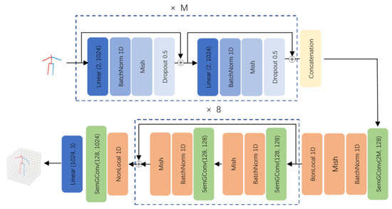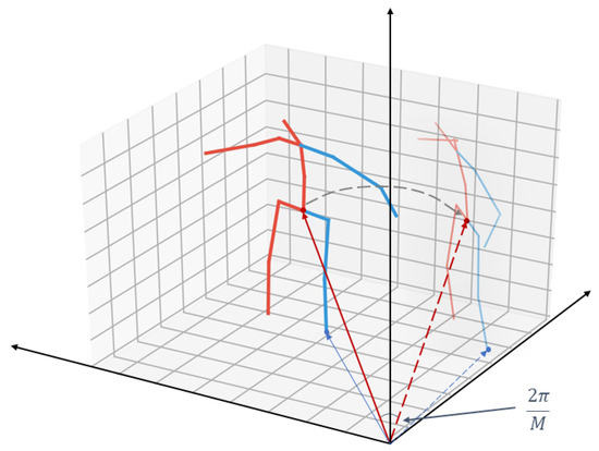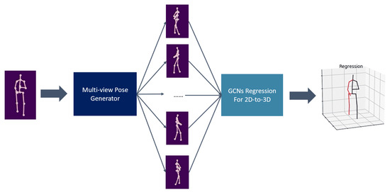 Firstly, we use the method described in Section 3.1 to build a MvPG. As shown in the upper part of Figure 5, in order to generate 2D poses from M perspectives, we need to combine MvPG in a symmetrical manner. The generated multi-views are symmetrical to each other at intervals of , thereby alleviating the occlusion problem and blurring problem of the front and back of the limbs in the single view. Then multi-view pose data are concatenated, which enables them to contain more hidden information than single-view data. Each pose is represented by a matrix. We simply combine the M pose data into a matrix, where every two columns represent a 2D pose in a single view angle and the row vectors represent the coordinates of each key point at 16 view angles. Then we take the matrix as the input of the 2D to 3D network.