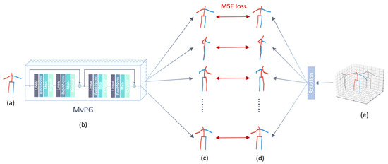 In order to train our MvPG, the datasets provide us with a series of 3D pose data, which contain the 3D coordinates of the joint points, skeleton information, and the camera coordinates in space and other data. We use the 3D coordinates of the human body and the coordinates of the camera in space to generate a 2D pose corresponding to the camera view. We use the 3D pose coordinates and the corresponding 2D pose coordinates of each view to train MvPG based on Equation (1).