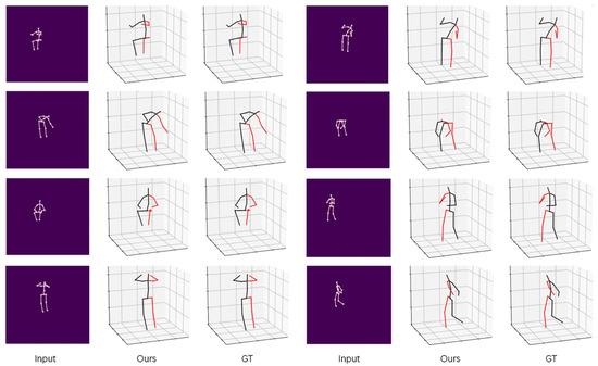 Visual results of our method on Human3.6M [20]. Red and black indicate left and right, respectively.