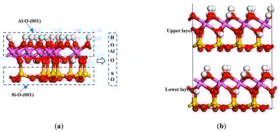 The first principles on the basis of DFT were carried out to study the crystal structure of the mineral surface and its structural parameters. Hong [] constructed the kaolinite unit cell model. Zhang [] constructed an interlayer cluster model of kaolinite. Zhao [] found that Fe and Cr atoms can easily be doped into the kaolinite lattice structure, while Ca, Mn and Be atoms can be doped into the kaolinite lattice at a higher temperature. Han’s calculation [] showed that there is a positive charge on the Al-(001) surface of kaolinite. On the contrary, there is a negative charge on the Si-(001) surface. Tunega, D. [] calculated the bond strength and length of the pkaolinite crystal cell based on the first principles. Zhang [] found that the interlayer charge of soft kaolinite is higher than hard kaolinite, and the crystallinity of the former is higher.