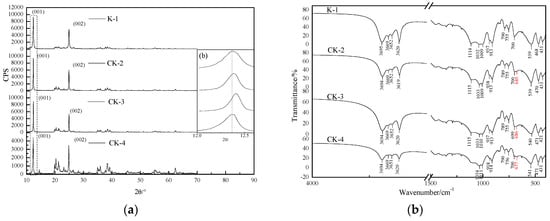 XRD and FTIR spectra of all kaolinite samples. (a) XRD; (b) FTIR spectra.