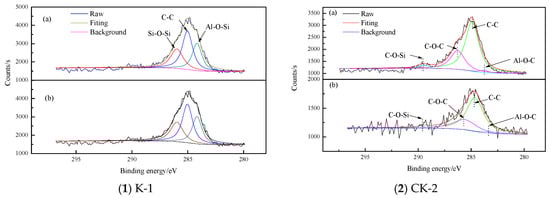 The XPS Spectra of C 1s for non-coal kaolinite and coal kaolinite: (a) Before etching; (b) After etching.
