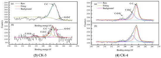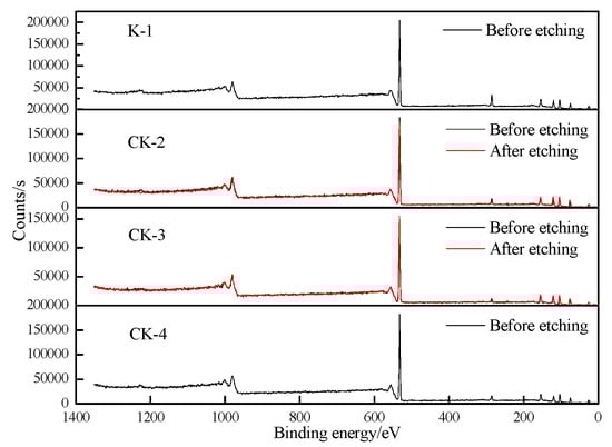 In order to further study the existence of elements, such as Al, Si, O and C, X-ray photoelectron spectroscopy was conducted as an effective analysis technique. According to the position of the photoelectron absorption peak (electron binding energy), it can identify the elements in the sample and the different forms of the same elements in the compound. The binding energy of Si 2p, Al 2p and O 1s electrons and their existing bonds in all four samples were very close to one another. Before and after etching, the Si 2p spectra show strong peaks at 103.00–103.55 eV, which belong to the Si-O bond. The Al 2p spectra show strong peaks at 74.84–75.74 eV, indicating the Al-O bond. The O 1s spectrum shows strong peaks in the range of 531.9–532.33 eV, which could indicate the existence of Si-O, Al-O and Si-O-Si bonds. The above binding energies are consistent with the silicon and aluminum oxides [,].