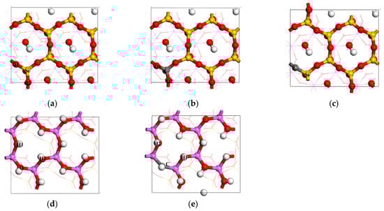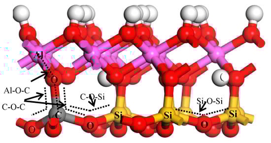 According to the isomorphism principle, the carbon atoms were most likely to substitute for the Si or O atoms of the kaolinite (001) surface, including the Si-O-(001) surface and Al-O-(001) surface, so that the substitution models, as shown in Figure 7b,c,e, represented the coal pyrite in the present study. For the coal kaolinite, the Si atom and O atom of both sides may be substituted. Therefore, the impurity substitution energies were calculated, as shown in Table 4.