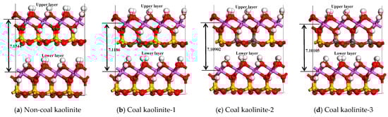 The XRD and XPS results showed that the interplanar spacing decreased due to the substitution of silicon atoms by carbon atoms. So, the double-layer model of the coal kaolinite (001) surface, doped with different amounts of carbon atoms, was further optimized and the interplanar spacing was calculated as follows: